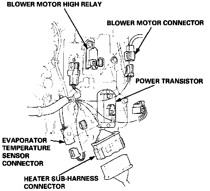 5. Disconnect the connectors from the power transistor, blower motor high relay, evaporator temperature sensor, blower motor and the heater sub-harness, then remove the blower motor and heater subharness connectors from the brackets. Disconnect the passenger's airbag harness clip.