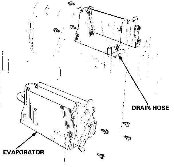 8. Disconnect the drain hose, and remove the seven self-tapping screws. Then pull the evaporator out of the front passengers side to remove it.