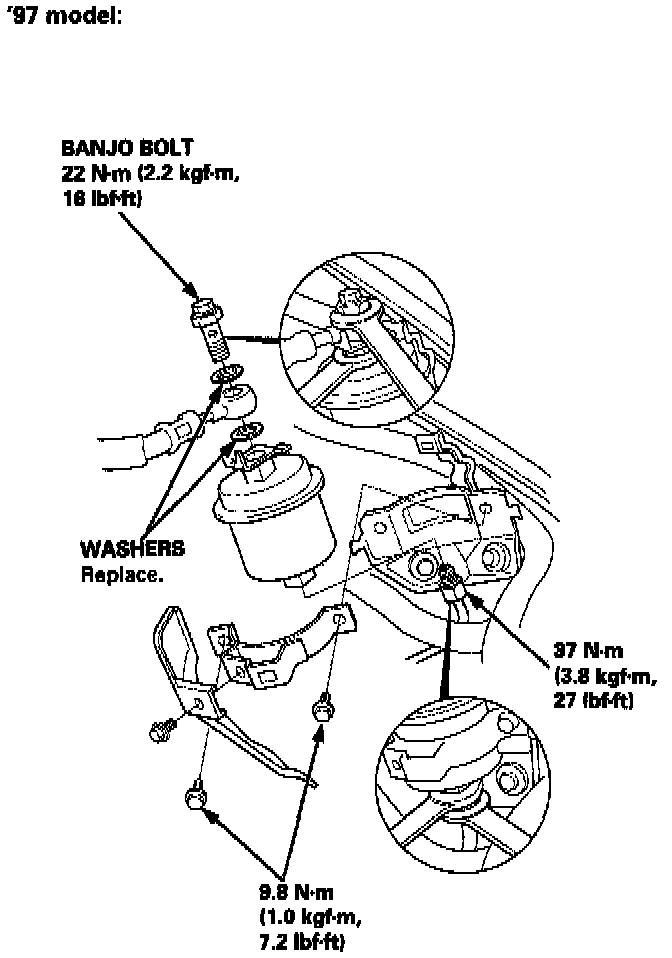 The fuel filter should be replaced whenever the fuel pressure drops below the specified value [260 - 310 kPa 12.65 - 3.15 kg/cm2, 37.7 - 44.8 psi) with the fuel pressure regulator vacuum hose disconnected and pinched] after making sure that the fuel pump and the fuel pressure regulator are 0K.