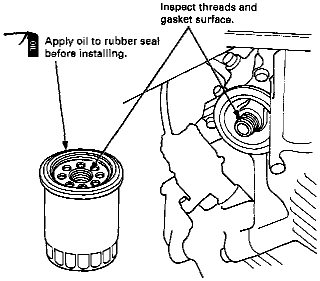 2. Inspect the threads and rubber seal on the new filter. Wipe off the seat on the oil filter base, then apply a light coat of oil to the rubber seal.