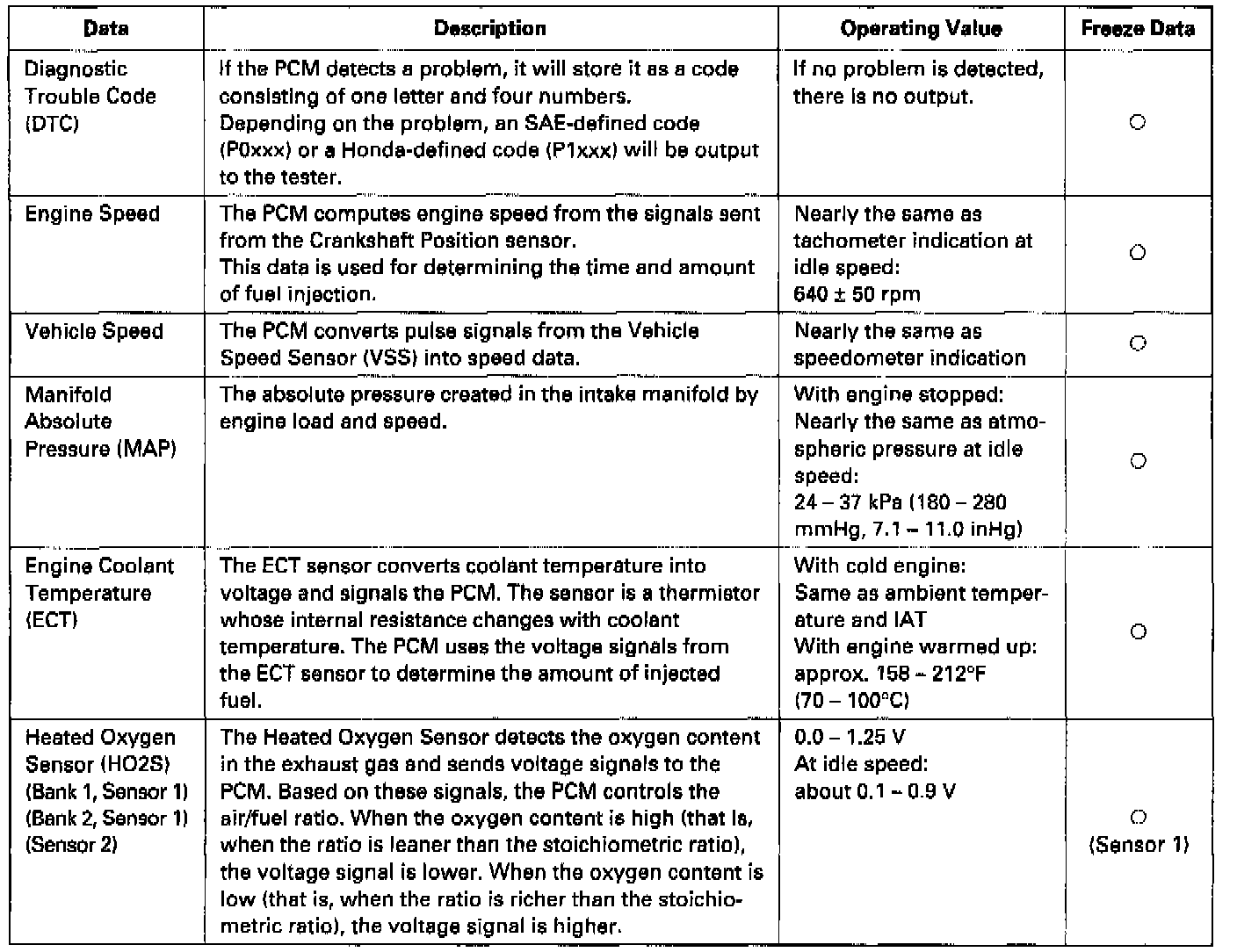 By connecting the OBD II scan tool or the Honda PGM Tester to the 16P data link connector (DLC), various data can be retrieved from the ECM. The items listed in the table above conform to the SAE recommended practice.