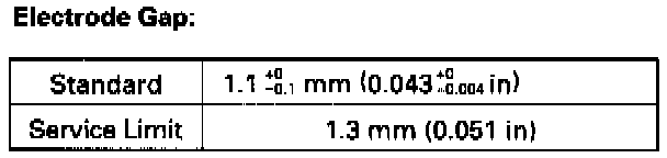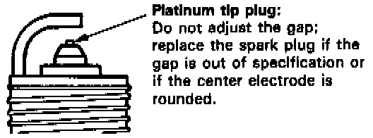2. Do not adjust the gap of platinum tip plugs; replace the spark plug if the gap is out of specification or if the center electrode is rounded.