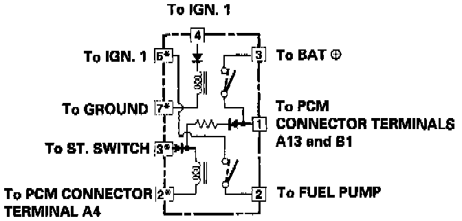 3. Attach the battery positive terminal to the No. 4 terminal and the battery negative terminal to the No. 7* terminal of the PGM-FI main relay. Then check that there is continuity between the No. 3 terminal and No. 1 terminal of the PGM-Fl main relay.