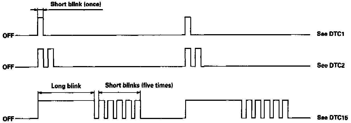When the PCM senses an abnormality in the input or output systems, the [D4] indicator light in the gauge assembly will blink. When the Service Check Connector (located under the dash on the passenger side) is connected with the special tool as shown, the [D4] indicator light will blink the Diagnostic Trouble Code (DTC) when the ignition switch is turned on (II).
