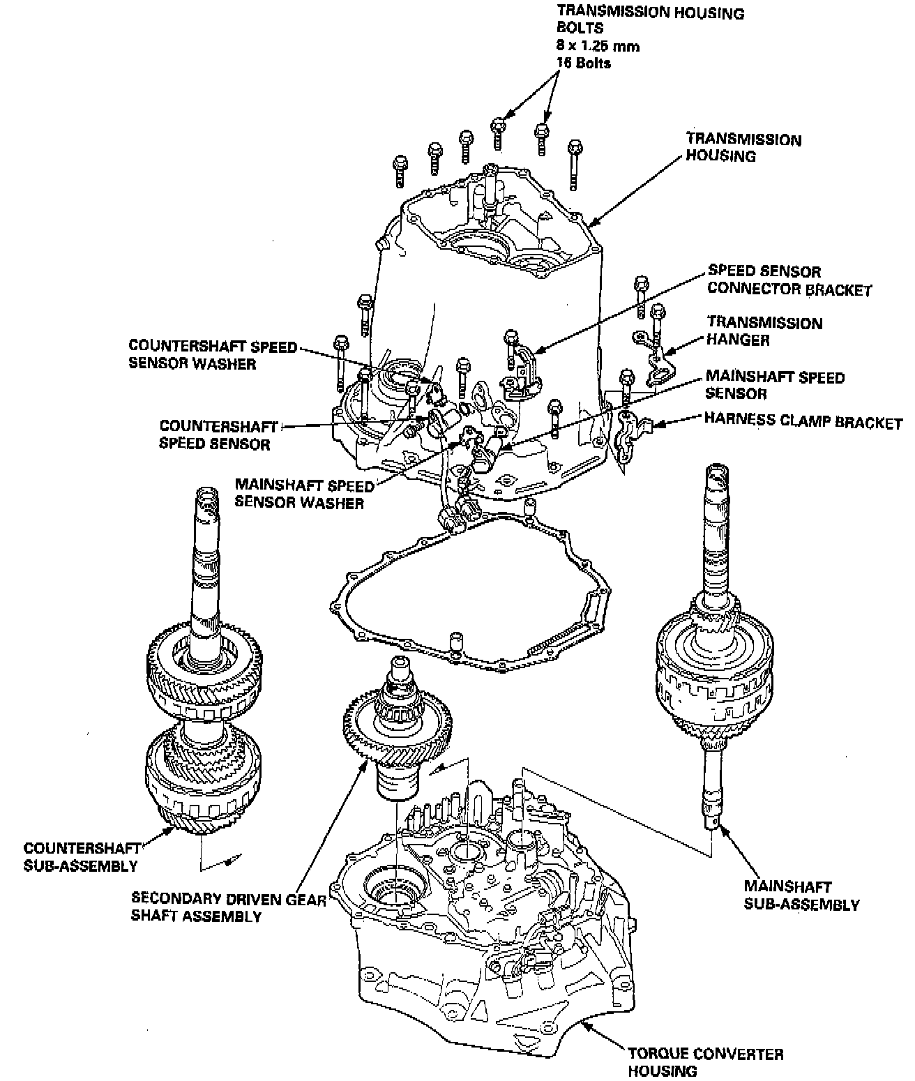 2. Remove the sixteen bolts securing the transmission housing with the transmission hanger, harness clamp bracket and speed sensor connector bracket.
