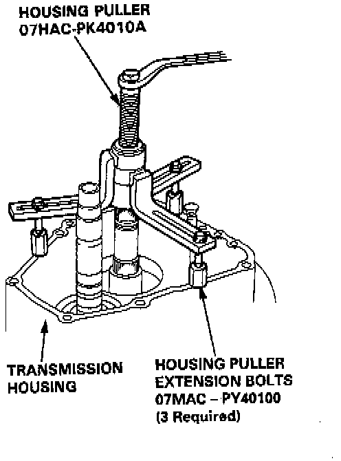 3. Install the special tools on the transmission housing, then remove the transmission housing as shown.