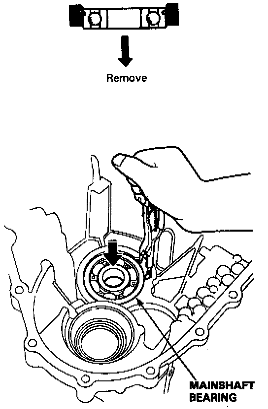 MAINSHAFT BEARING REPLACEMENT1. To remove the mainshaft bearing from the transmission housing, expand the snap ring with the snap ring pliers, then push the bearing out.