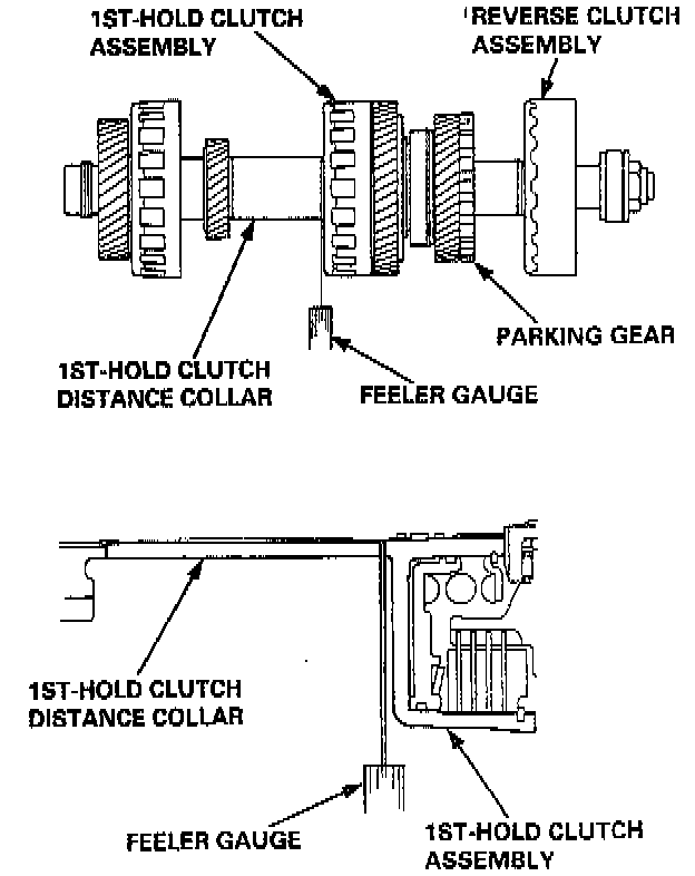 3. Hold the 1st-hold clutch assembly against the parking gear. Measure the clearance between the 1st-hold clutch distance collar and the 1st-hold clutch with a feeler gauge.
