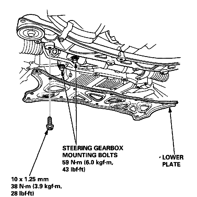 10. Remove the steering gearbox mounting bolts, then install the lower plate and the steering gearbox mounting bolts.