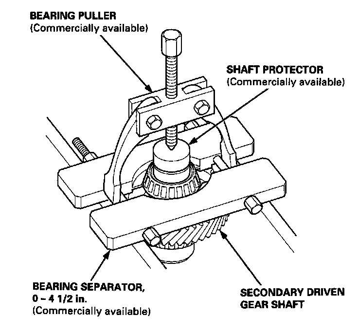 1. Remove the tapered roller bearings from the secondary driven gear shaft using a bearing puller and separator as shown.