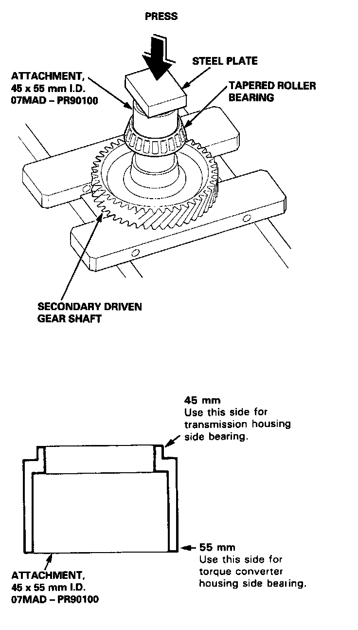 - If the transmission housing, torque converter housing, secondary driven gear shaft, tapered roller bearing, outer race, thrust shim, or thrust washer were replaced, the bearing preload must be adjusted.