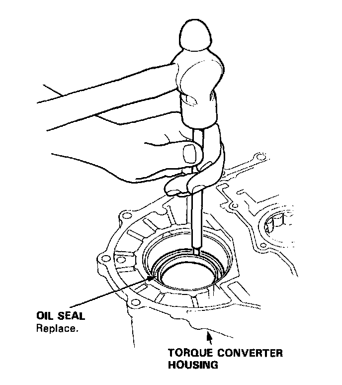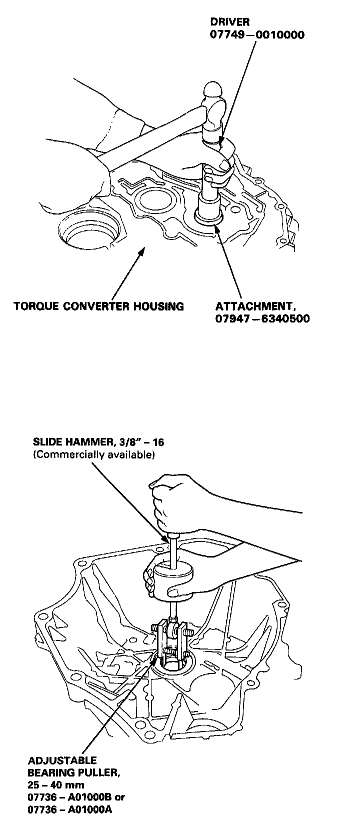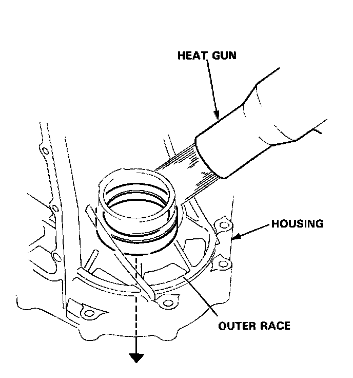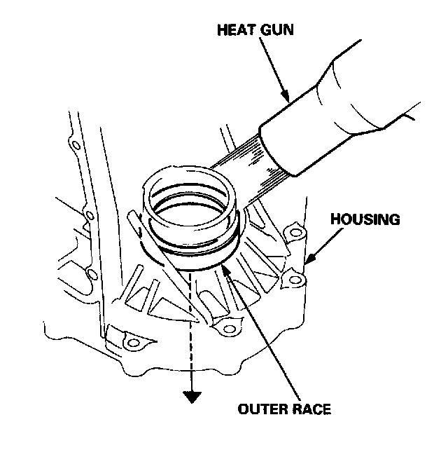 1. Remove the bearing outer race from the transmission housing and torque converter housing by heating the housing to about 212°F (100°C).