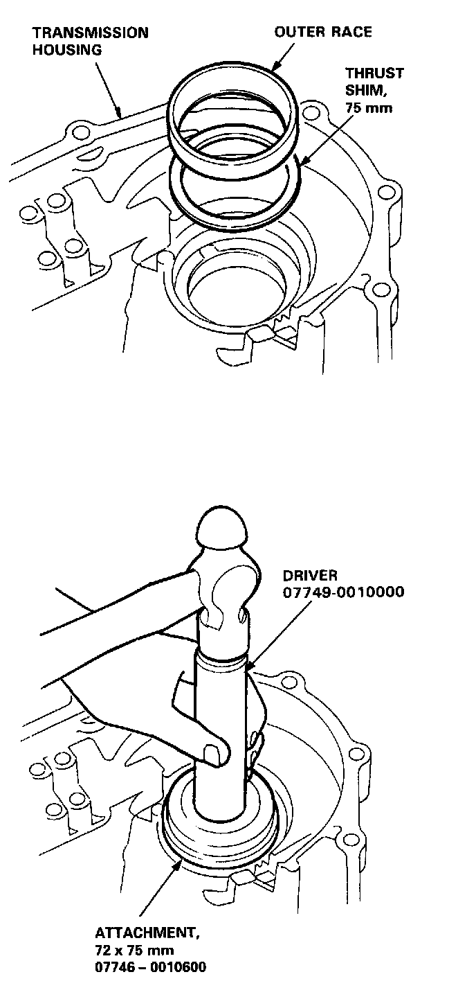 4. After installing the thrust shim, install the outer race in the transmission housing using the special tools.