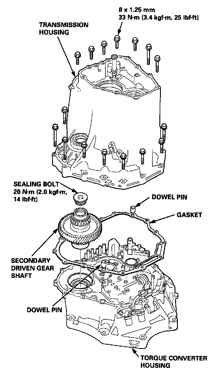 6. With the mainshaft and countershaft removed, install the secondary driven gear shaft, and torque the transmission housing.