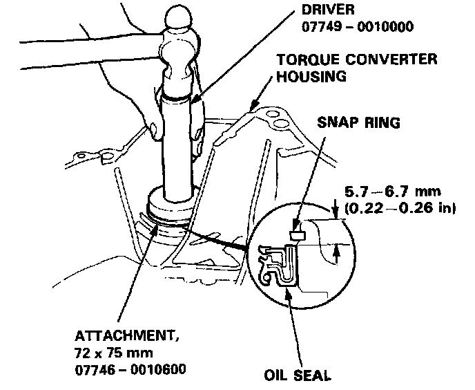 2. Install the oil seal into the torque converter housing using the special tools as shown.