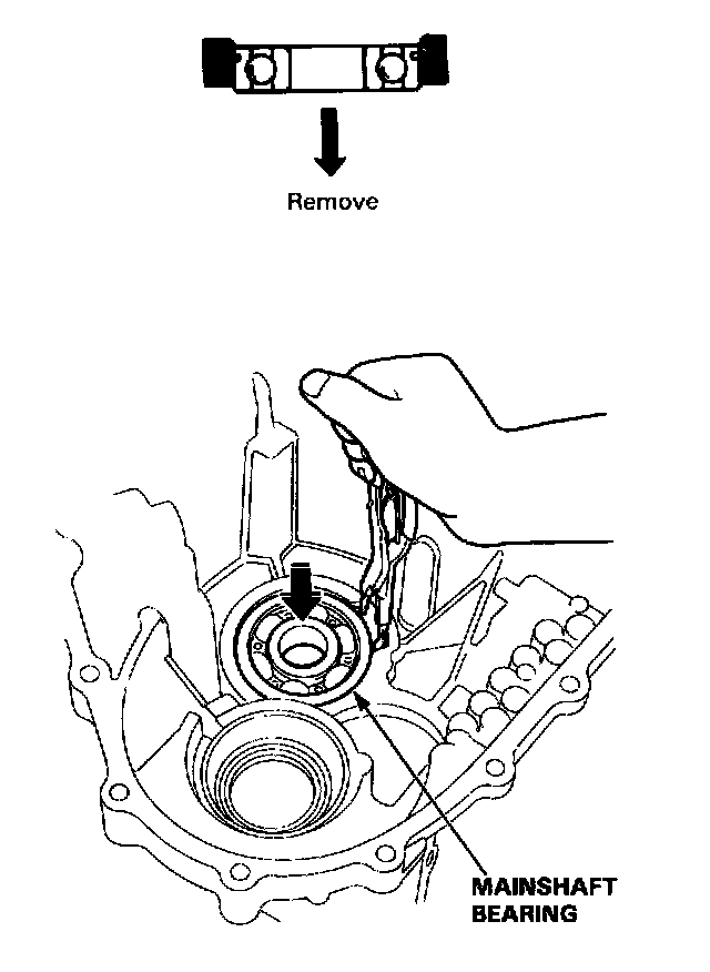 1. To remove the mainshaft bearing from the transmission housing, expand the snap ring with the snap ring pliers, then push the bearing out.