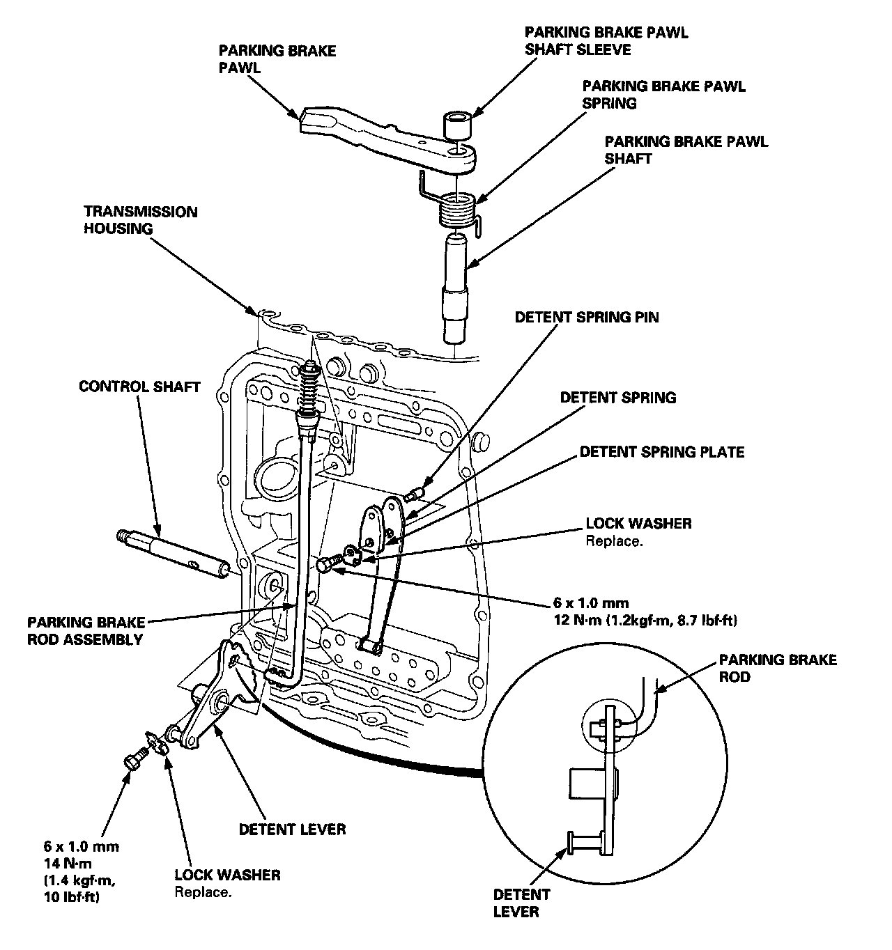 13. Install the parking brake rod assembly with the detent lever on the control shaft, and install the detent spring on the transmission housing, if necessary.