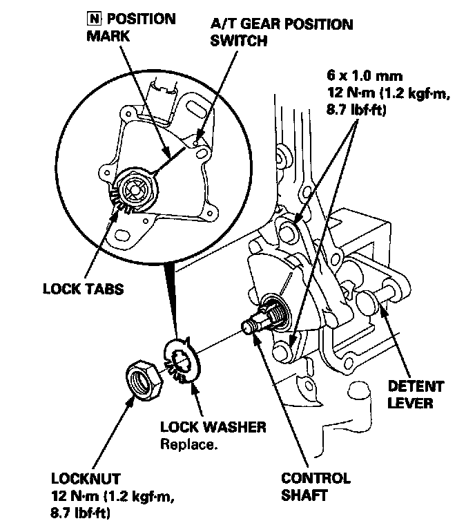 4. Install a new lock washer on the A/T gear position switch by aligning its projected tip with the H position mark on the A/T gear position switch as shown.