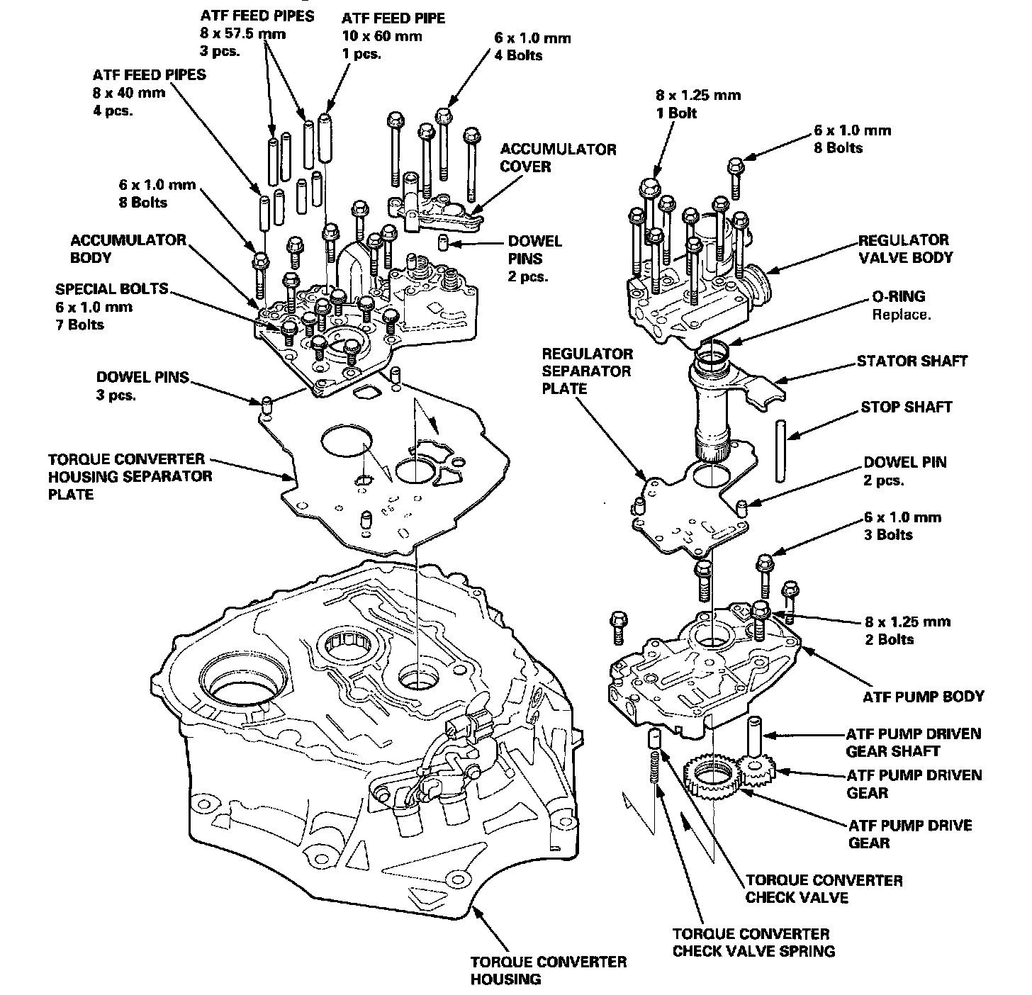 8. Realign the ATF pump driven gear shaft, reinstall the accumulator body and the accumulator cover, then retighten the bolts on the ATF pump body to the specified torque. Recheck the ATF drive gear and the ATF driven gear shaft movement.