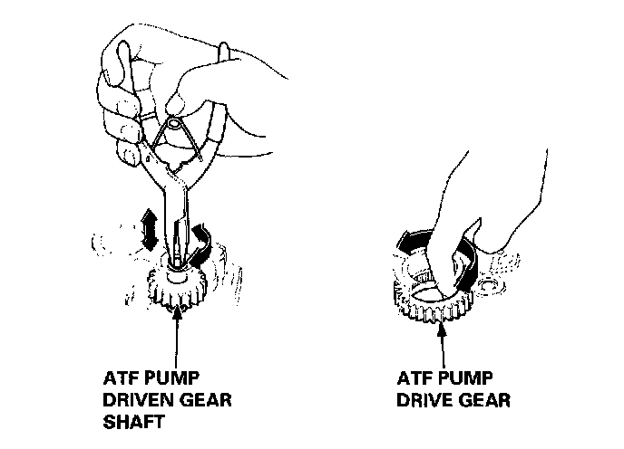 6. Tighten the bolts on the ATF pump body to the specified torque. Make sure the ATF drive gear and the ATF driven gear shaft move smoothly.