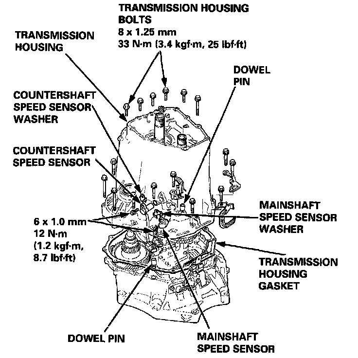 CAUTION: Make sure that the mainshaft and countershaft speed sensors are not installed on the transmission housing before installing the transmission housing on the torque converter housing.