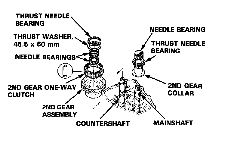 22. Install the countershaft 2nd gear assembly, 2nd gear one-way clutch, needle bearings, thrust washer, and thrust needle bearing on the countershaft.
