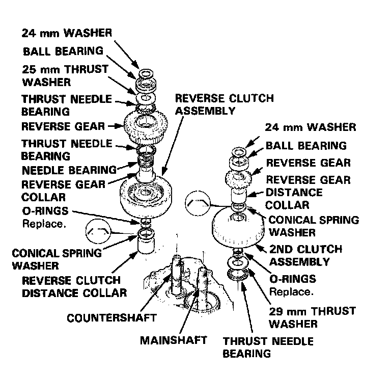 31. Install the 2nd clutch assembly on the mainshaft, then install the reverse clutch assembly, reverse gear collar, needle bearing, thrust needle bearing, reverse gear, thrust needle bearing, 25 mm thrust washer and ball bearing on the countershaft.