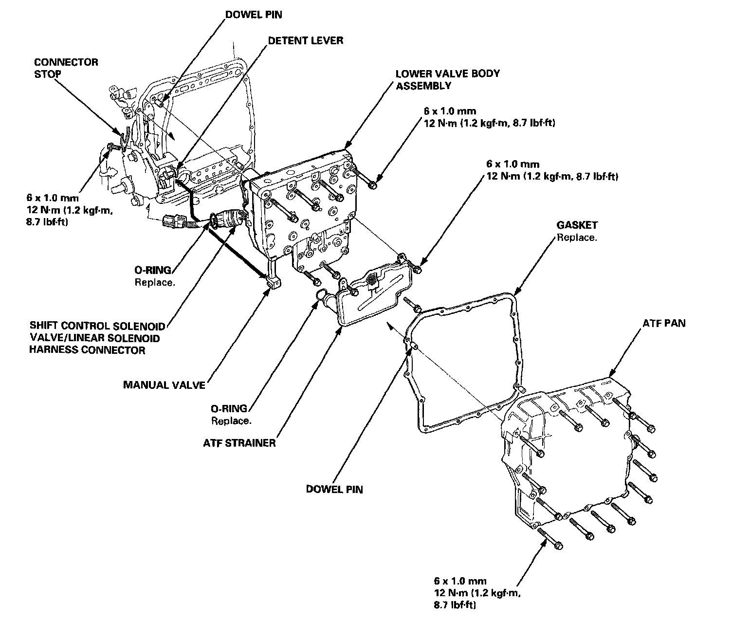 44. Pass the shift control solenoid valve/linear solenoid harness through the transmission housing, and put the manual valve and the detent lever together. Then install the lower valve body assembly (six bolts) with two dowel pins in the transmission housing.