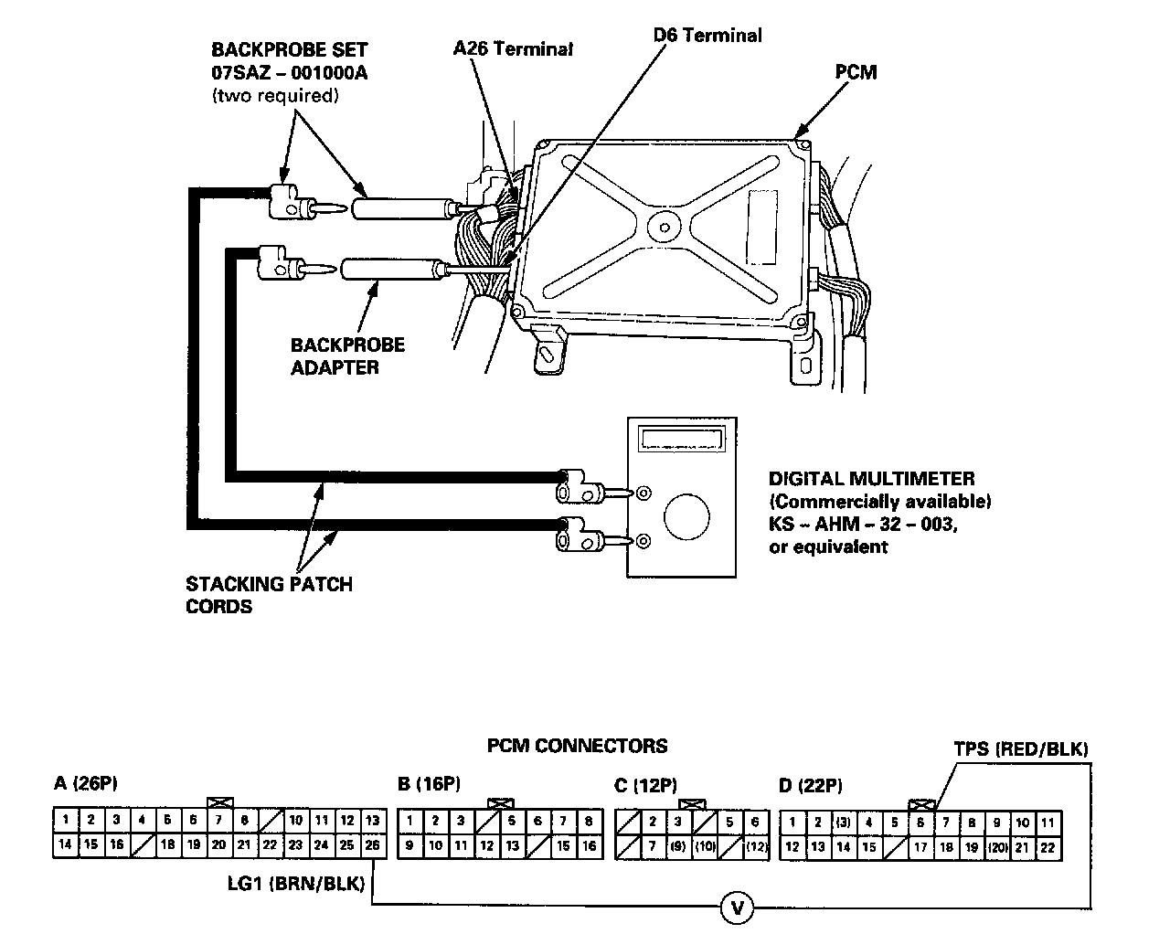 - 2. Set the digital multimeter to check voltage between D6 (+) terminal and A26 (-) terminal of the PCM for the throttle position sensor.