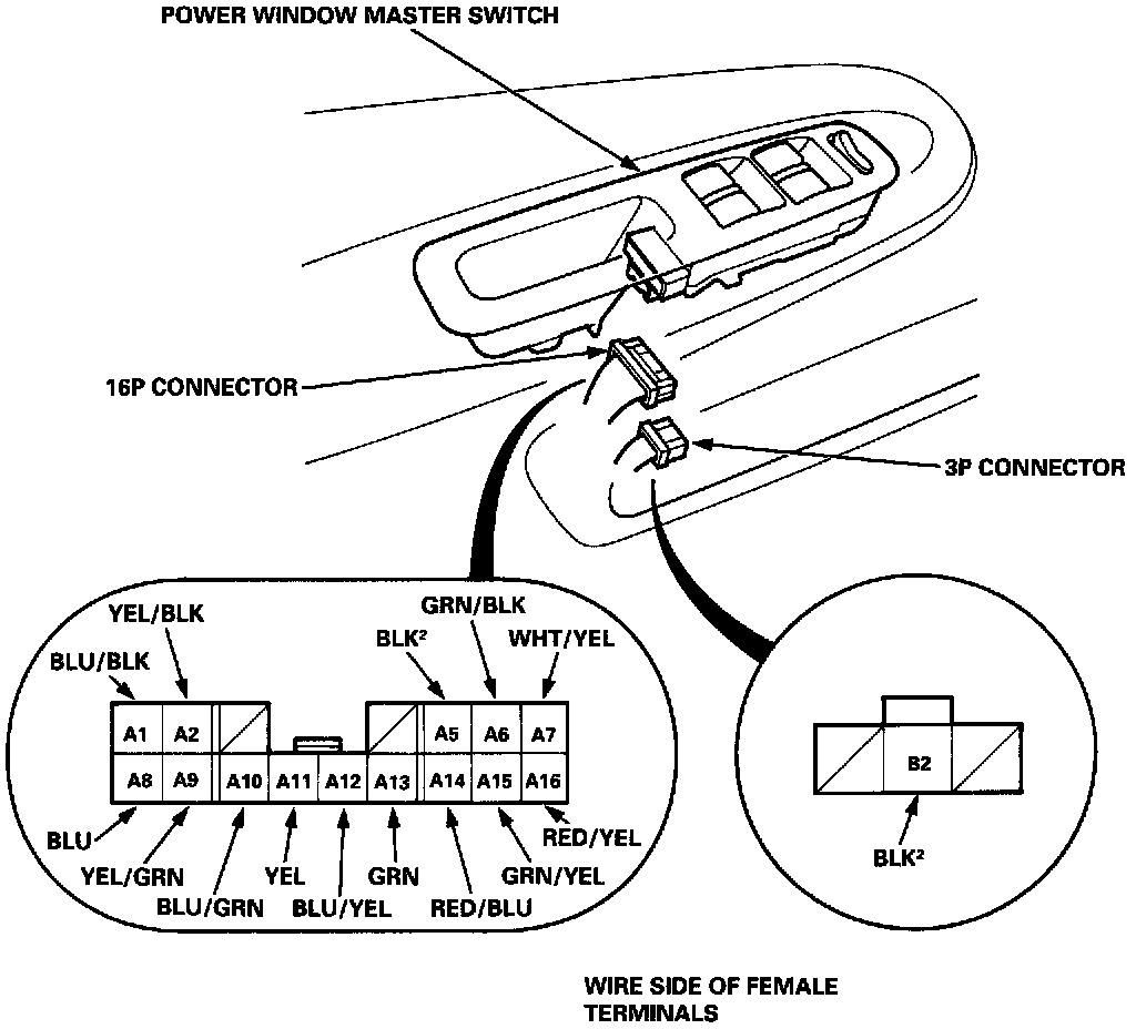NOTE: The control unit is built into the power window master switch, and only controls driver's door window operations.1. Remove the driver's door panel, and disconnect the 16P and 3P connectors from the master switch.