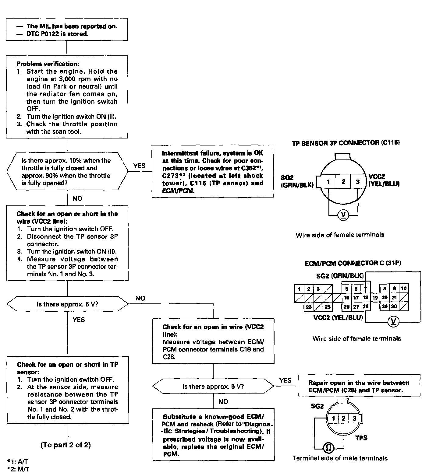 The scan tool indicates Diagnostic Trouble Code (DTC) P0122: A low voltage problem in the Throttle Position (TP) sensor Circuit.