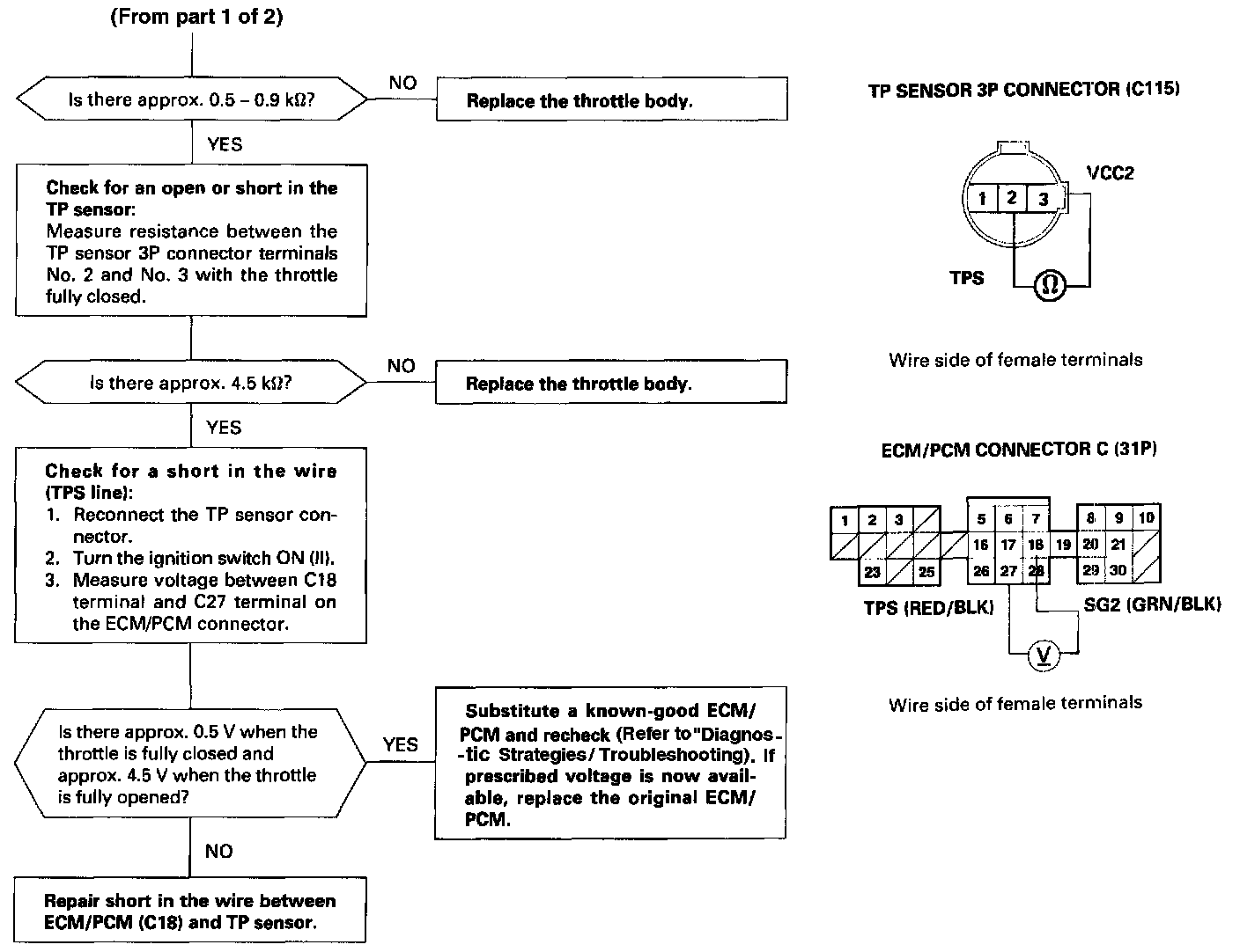 The TP Sensor is a potentiometer. It is connected to the throttle valve shaft. As the throttle position changes, the throttle position sensor varies the voltage signal to the ECM/PCM.
