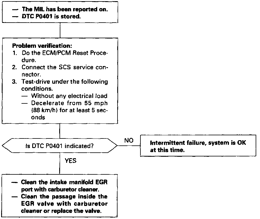 Deterioration (clogging, leakage, etc.) in the EGR line or EGR valve is detected by means of the changes in MAP before and after the operation of the EGR valve. If deterioration has been detected during two consecutive driving cycles, the MIL will come on and DTC P0401 will be stored.
