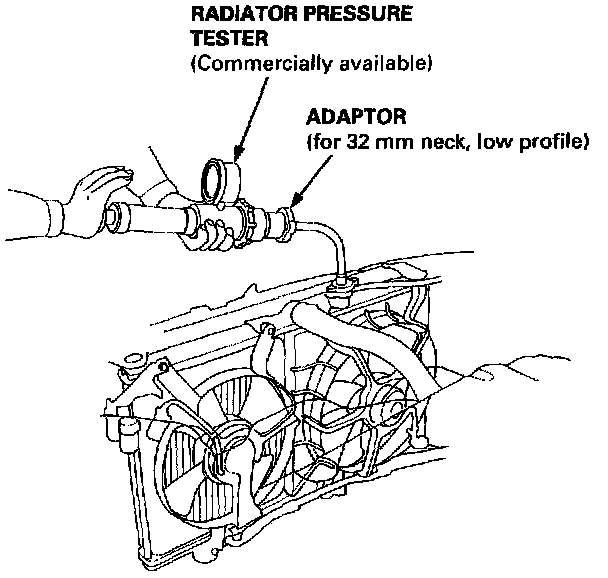 1. Wait until the engine is cool, then carefully remove the radiator cap and fill the radiator with engine coolant to the top of the filler neck.2. Attach the pressure tester to the radiator and apply a pressure of 93 - 123 kPa (14 - 18 psi).