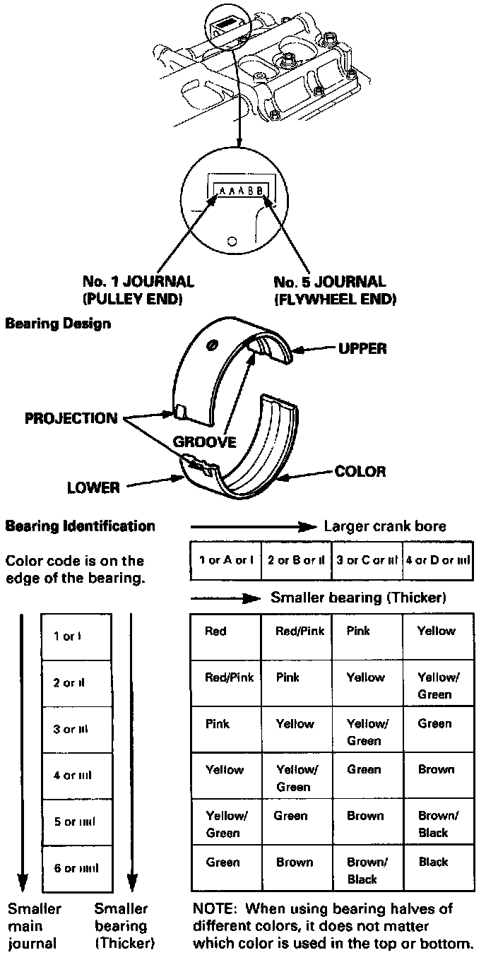 6. If the plastigage measures too wide or too narrow, (remove the engine if it's still in the car), remove the crankshaft, and remove the upper half of the bearing. Install a new, complete bearing with the same color code (select the color as shown in chart in the image), and recheck the clearance.