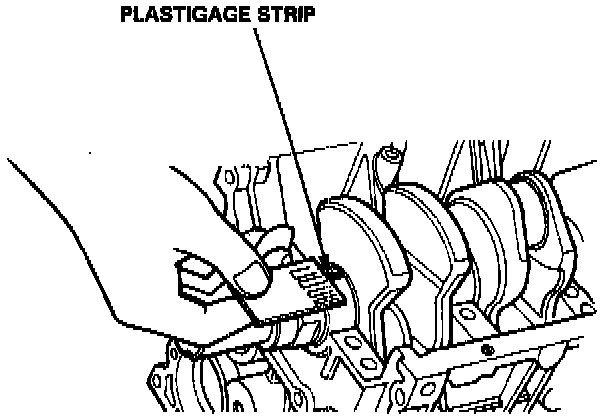 NOTE: If the engine is still in the car when you bolt the main cap down to check clearance, the weight of the crankshaft and flywheel will flatten the plastigage further than just the torque on the cap bolt and give you an incorrect reading. For an accurate reading, support the crank with a jack under the counterweights, and check only one bearing at a time.