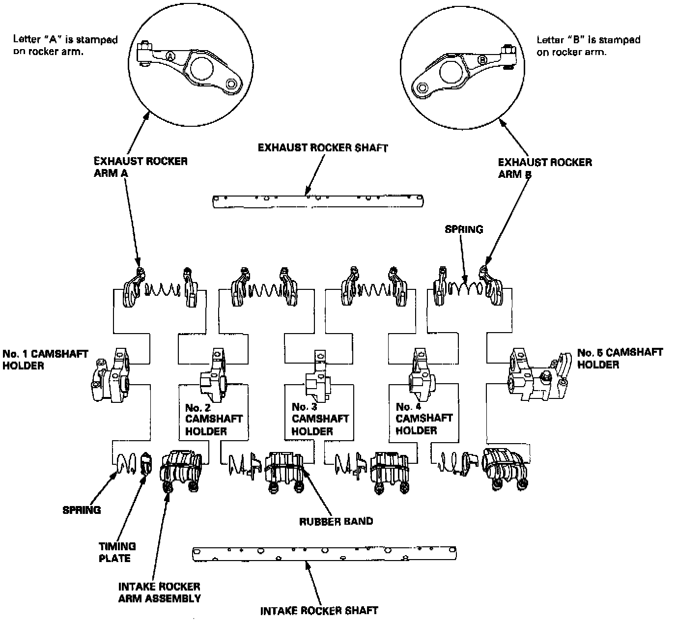 - When removing or installing the rocker arm assembly, do not remove the camshaft holder bolts. The bolts will keep the holders, springs and rocker arms on the shaft.