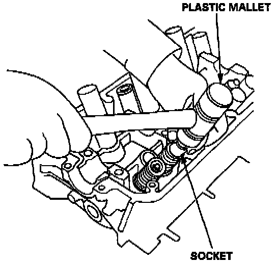 NOTE: Identify valves and valve springs as they are removed so that each item can be reinstalled in its original position.1. Using an appropriate-sized socket and plastic mallet, lightly tap the valve retainer to loosen the valve keepers.