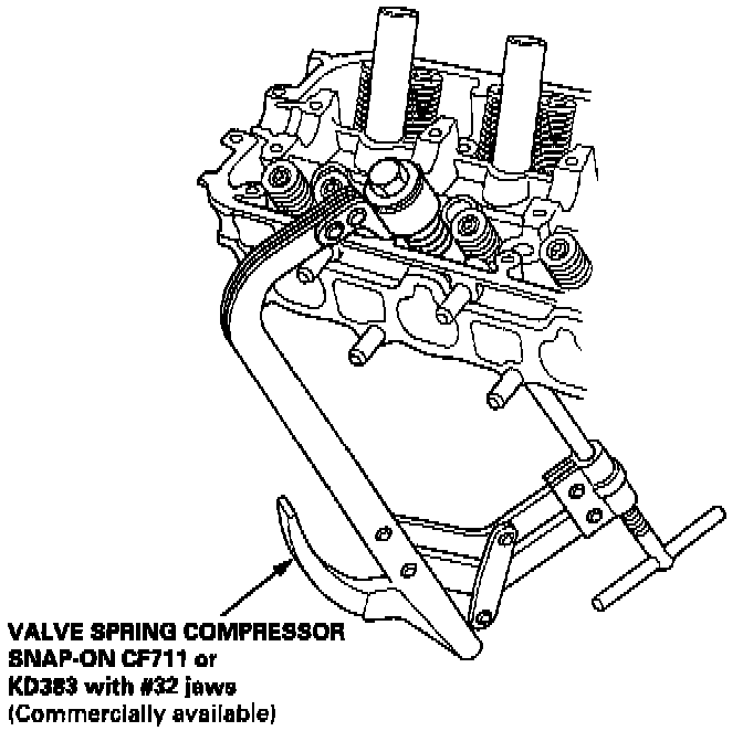 2. Install the valve spring compressor. Compress the spring and remove the valve keepers.