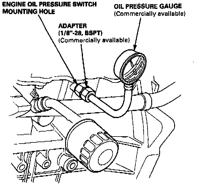 2. Remove the engine oil pressure switch and install an oil pressure gauge.