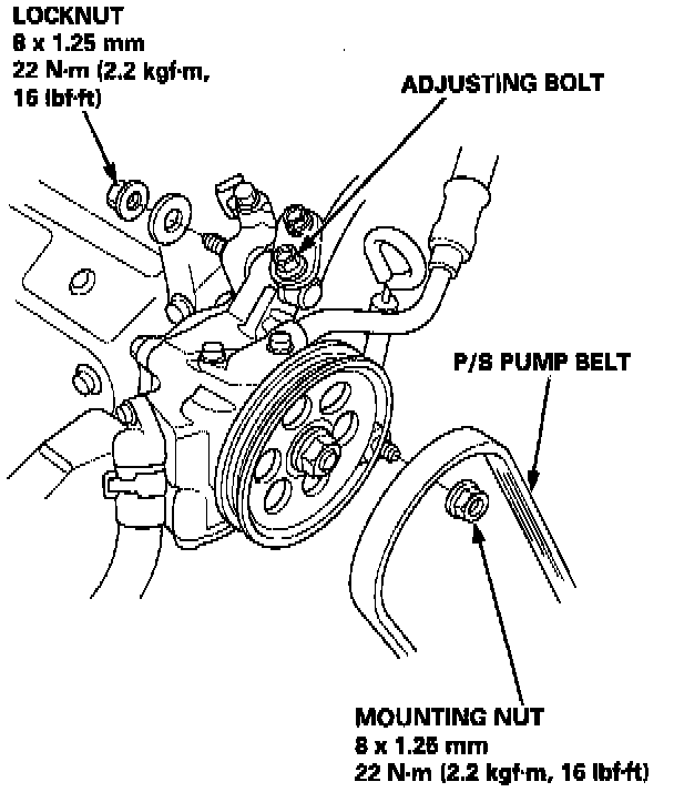 14. Remove the mounting nut, locknut and adjusting bolt, then remove the P/S pump belt and pump.