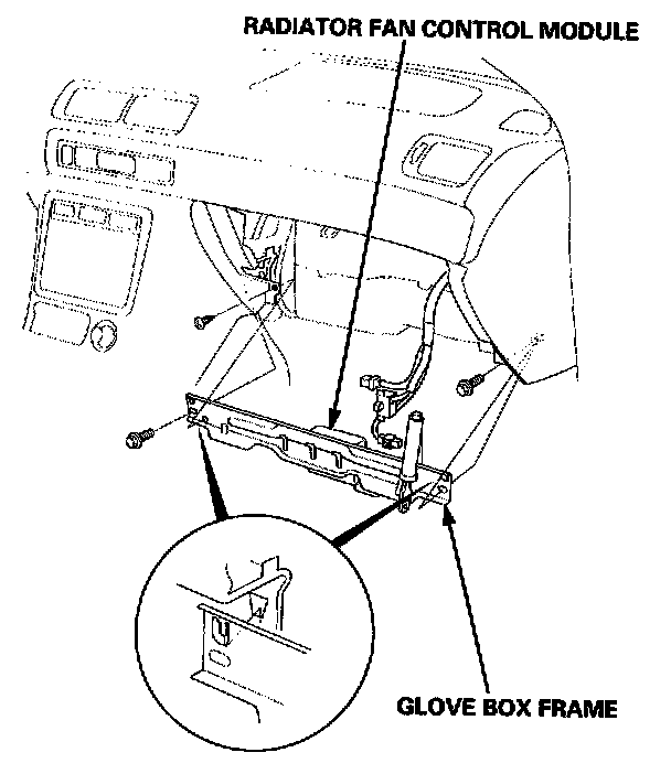 4. Remove the bolts and the glove box frame, then disconnect the connectors from the radiator fan control module and the glove box frame.