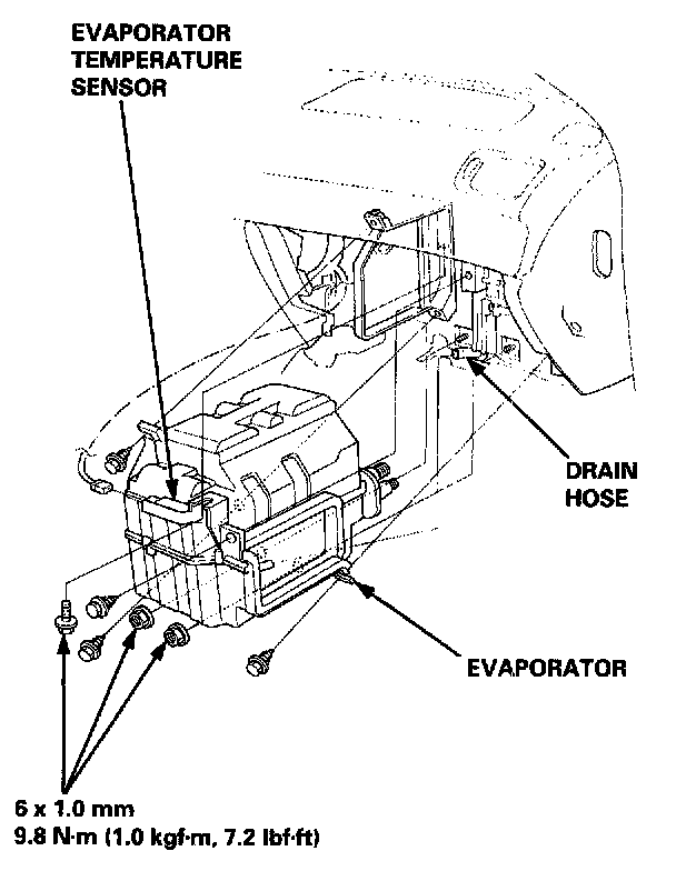 5. Disconnect the drain hose and the connector from the evaporator temperature sensor. Remove the self-tapping screws, the mounting nuts, the mounting bolt and the evaporator.