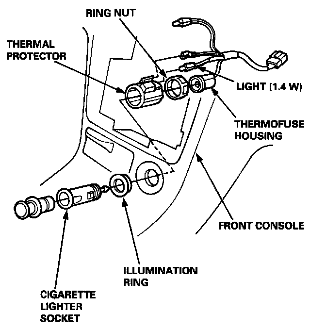 4. When installing the cigarette lighter, align each lug on the face panel, illumination ring, and cigarette lighter socket with the groove in the hole, then position the bulb housing on the thermal protector between the stops in the console panel.