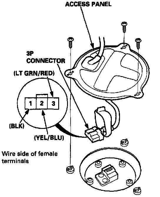4. Remove the fuel tank access panel, and disconnect the 3P connector from the fuel gauge sending unit. Connect the No.3 terminal to the No.1 terminal with a jumper wire.