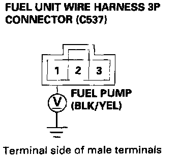 4. Check that battery voltage is available between the fuel unit wire harness 3P connector (harness side) connector terminal No.1 and body ground when the ignition switch is turned ON (II).