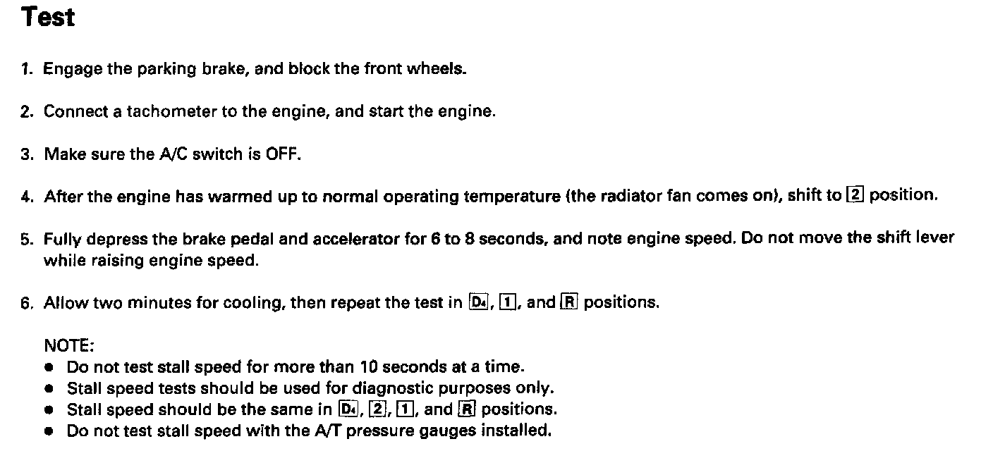 - Stall speed should be the same in [D4], [2], [1], and [R] positions.