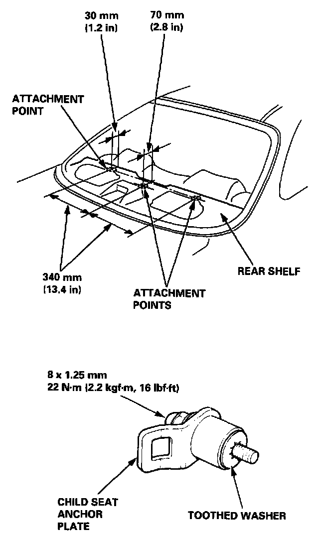 Child Seat Anchor Plate InstallationAttachment points are provided for a rear seat mounted child restraint system which uses a top tether. The attachment points are located on the rear shelf, just behind the rear seat-back. When using a child seat with a top tether, install the child seat anchor plates securely.