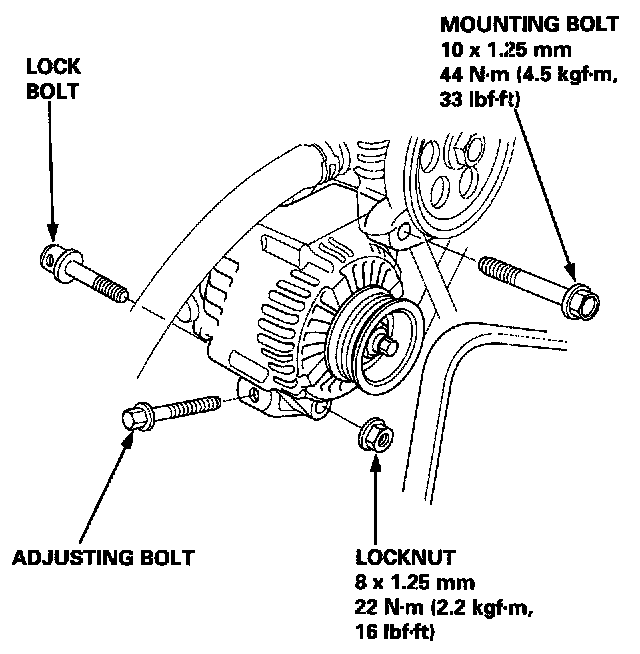 4. Remove the adjusting bolt, lock bolt, locknut and mounting bolt, then remove the alternator belt and alternator.