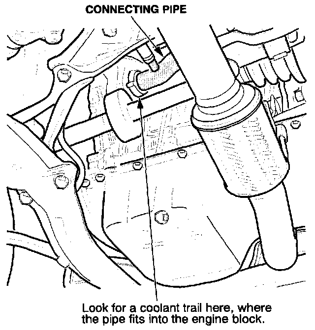 Look for a coolant trail where the connecting pipe fits into the engine block. Replace the connecting pipe and both 0-rings if you see a coolant trail.